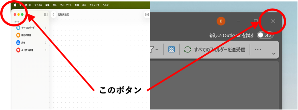 どちらも閉じるボタンを押すと開いているWindowは閉じられるのですが、Macではそのアプリは終了されません。