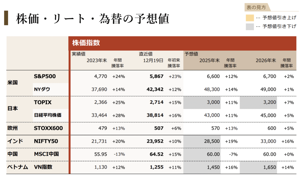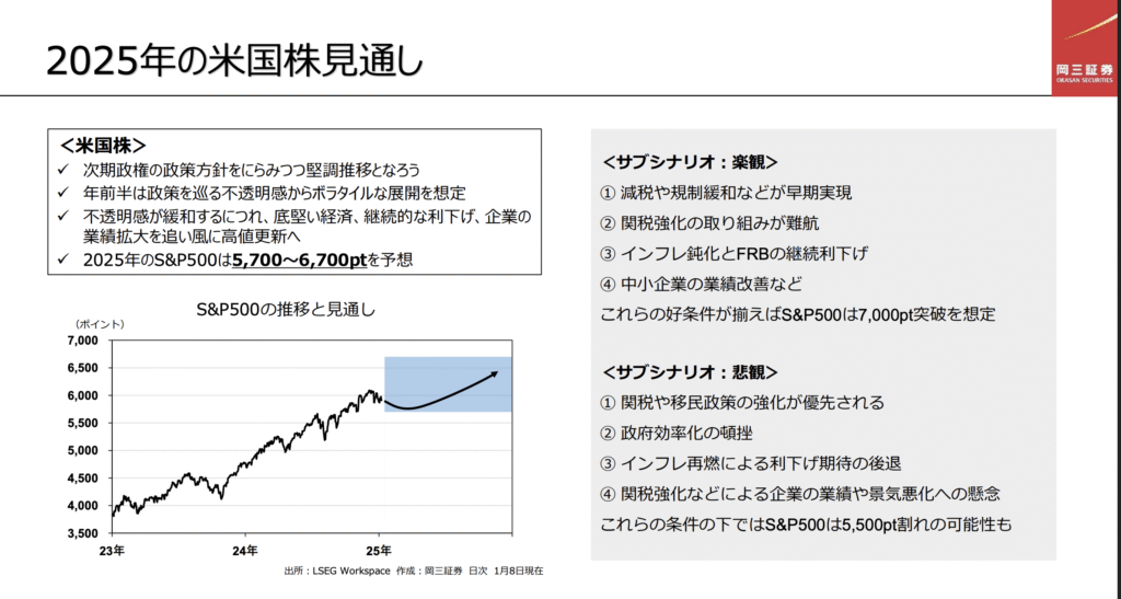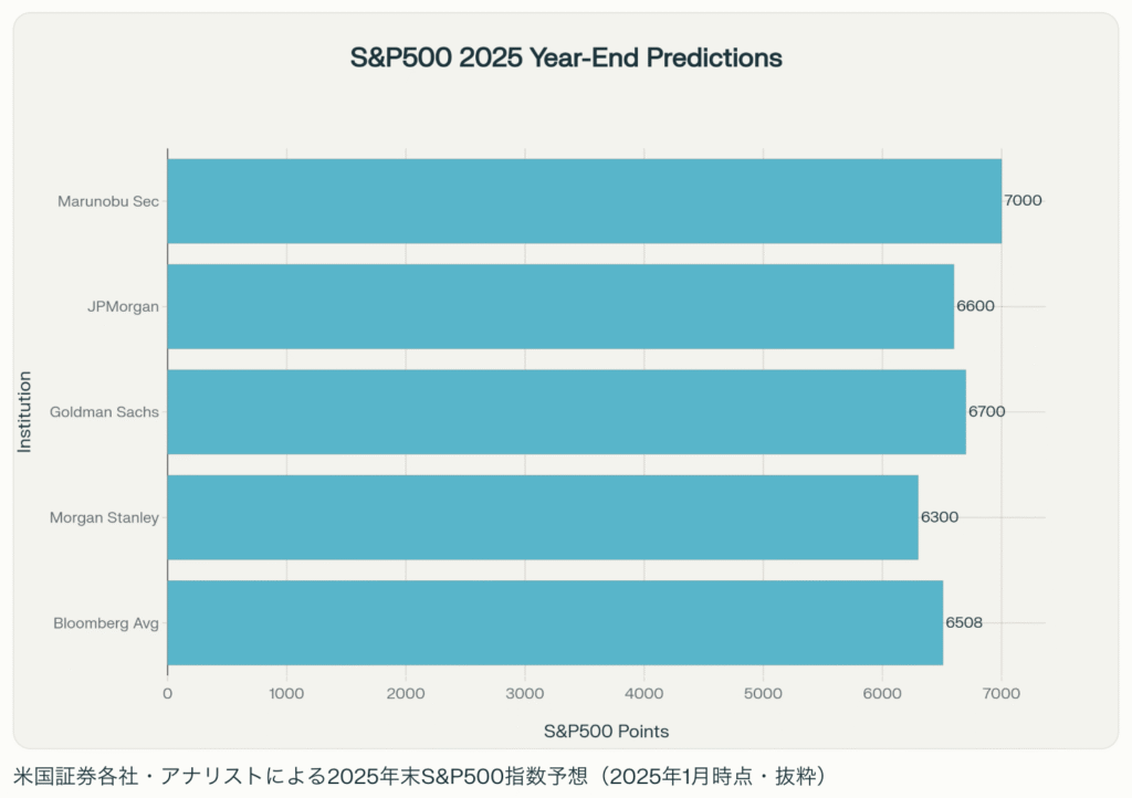 ちなみに年初に発表されている2025年末のS&P500の予想を見返してみると、以下のようなものがありました。