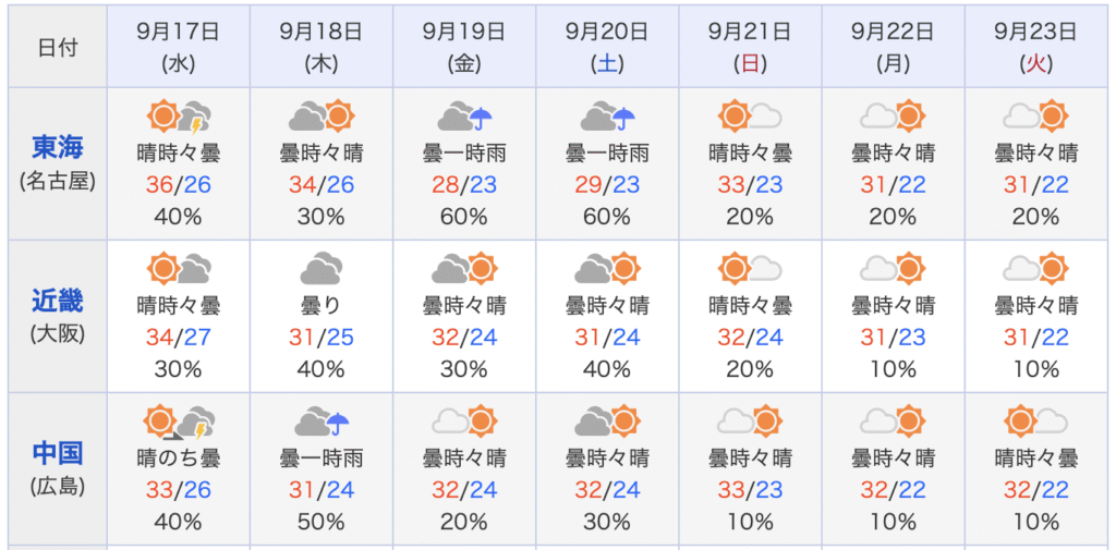 名古屋あたりでは、9月も半ばだと言うのに、まだまだ36℃の日もあるようです。