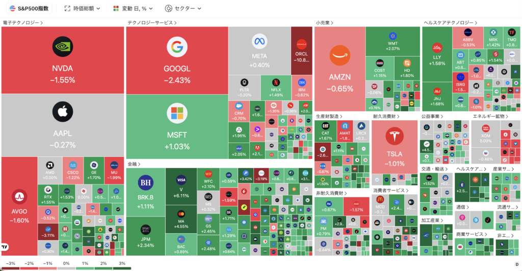 久しぶりにヒートマップを見てみると、テクノロジー系に赤が目立ちます。