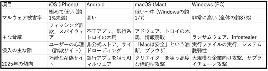 ちなみに、Geminiさんに各OSの安全性を比較してもらったところ、下記のようにまとめてくれました。やはり、比較的アップルのほうが安全性が高そうです。