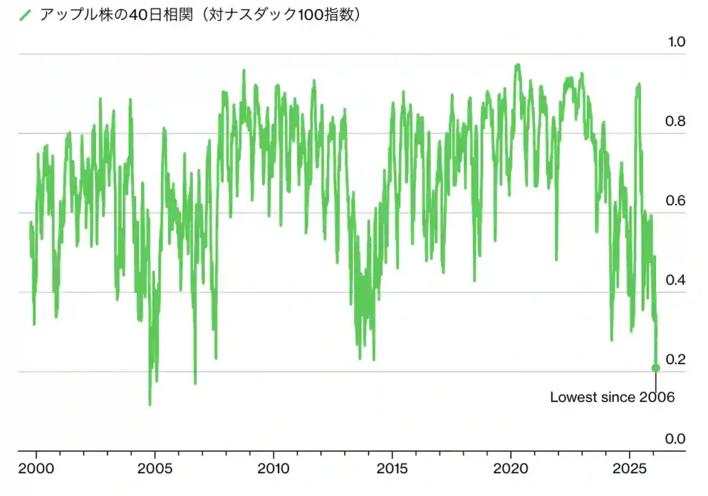 同社は巨額のAI設備投資競争とは一定の距離を置いており、ナスダック100指数との相関が2006年以来の低水準にまで低下しています。