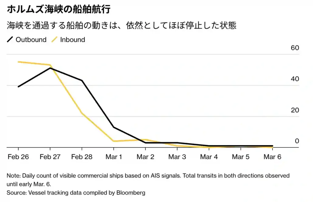 ホルムズ海峡を通過する船舶はほぼ停止しており、通常時に同海峡を通る日量2000万バレルの大部分が滞留しています。