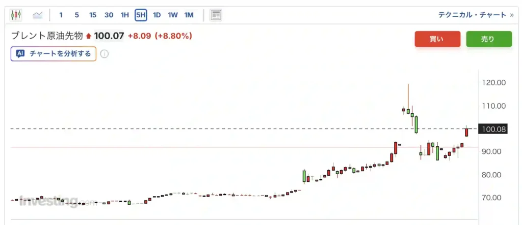 北海ブレント原油は一時1バレル99ドル台まで急騰し、100ドル突破が現実味を帯びてきました。