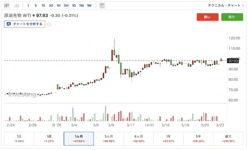 WTI原油先物は3月20日時点で1バレル98.32ドルとなり、100ドル到達が目前に迫っています。