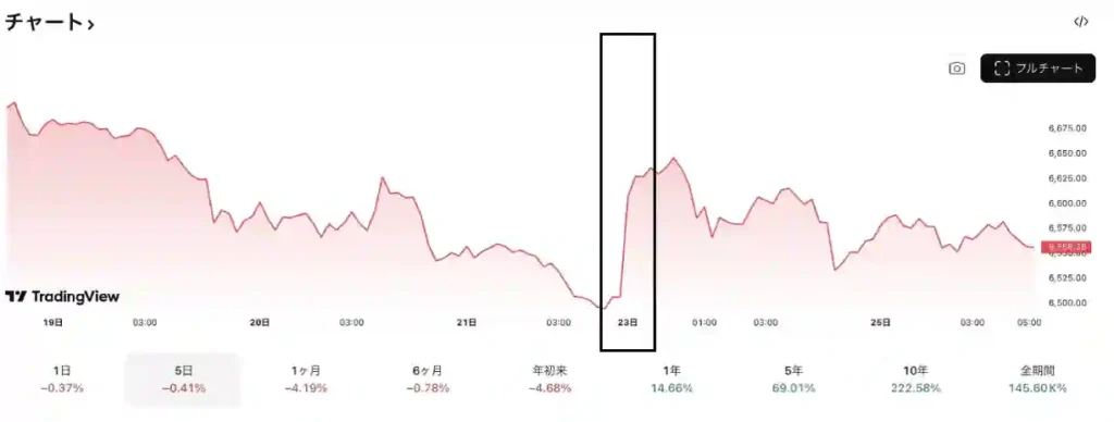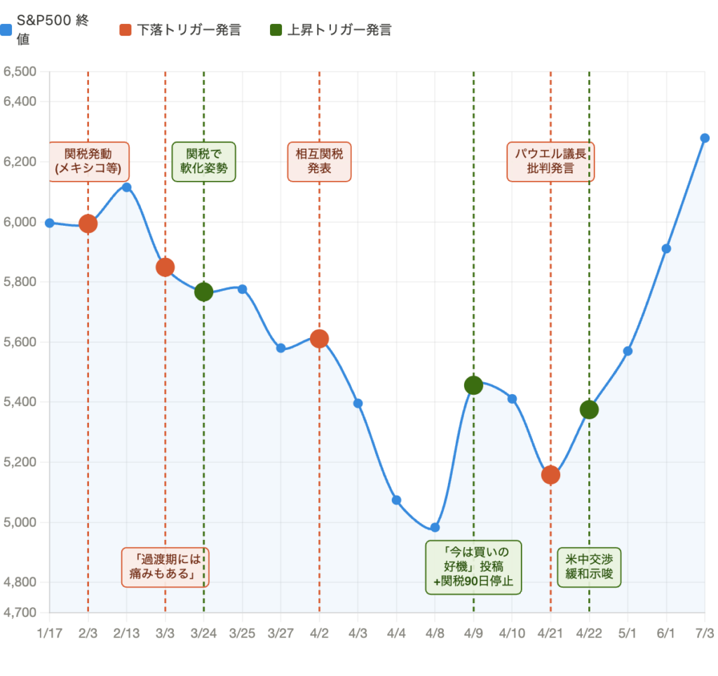 2025年3月にも、相互関税に関する発言の変化をきっかけに、S&P500が一日で大きく上昇する場面がありました。