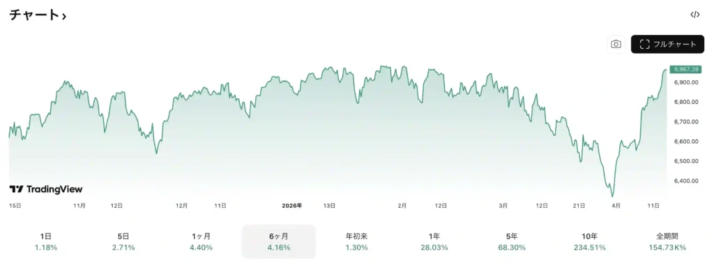2026年4月14日の米国市場で+1.18%の上昇、6967ポイントと最高値に迫る勢いです。