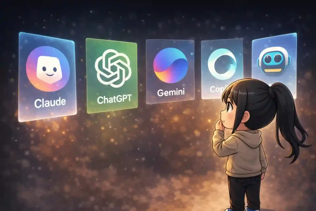 ミトスはサイバーセキュリティ特化の話ですが、日常使いのAIとしてのClaudeはどうなのか。ここで主要AI(ChatGPT・Gemini・Copilot)との比較をまとめてみます。