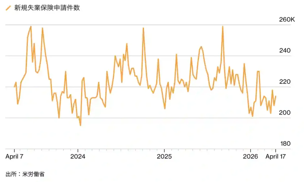 しかし米国の新規失業保険申請件数は足元でも21万4,000件前後と、歴史的な低水準付近で安定しています。